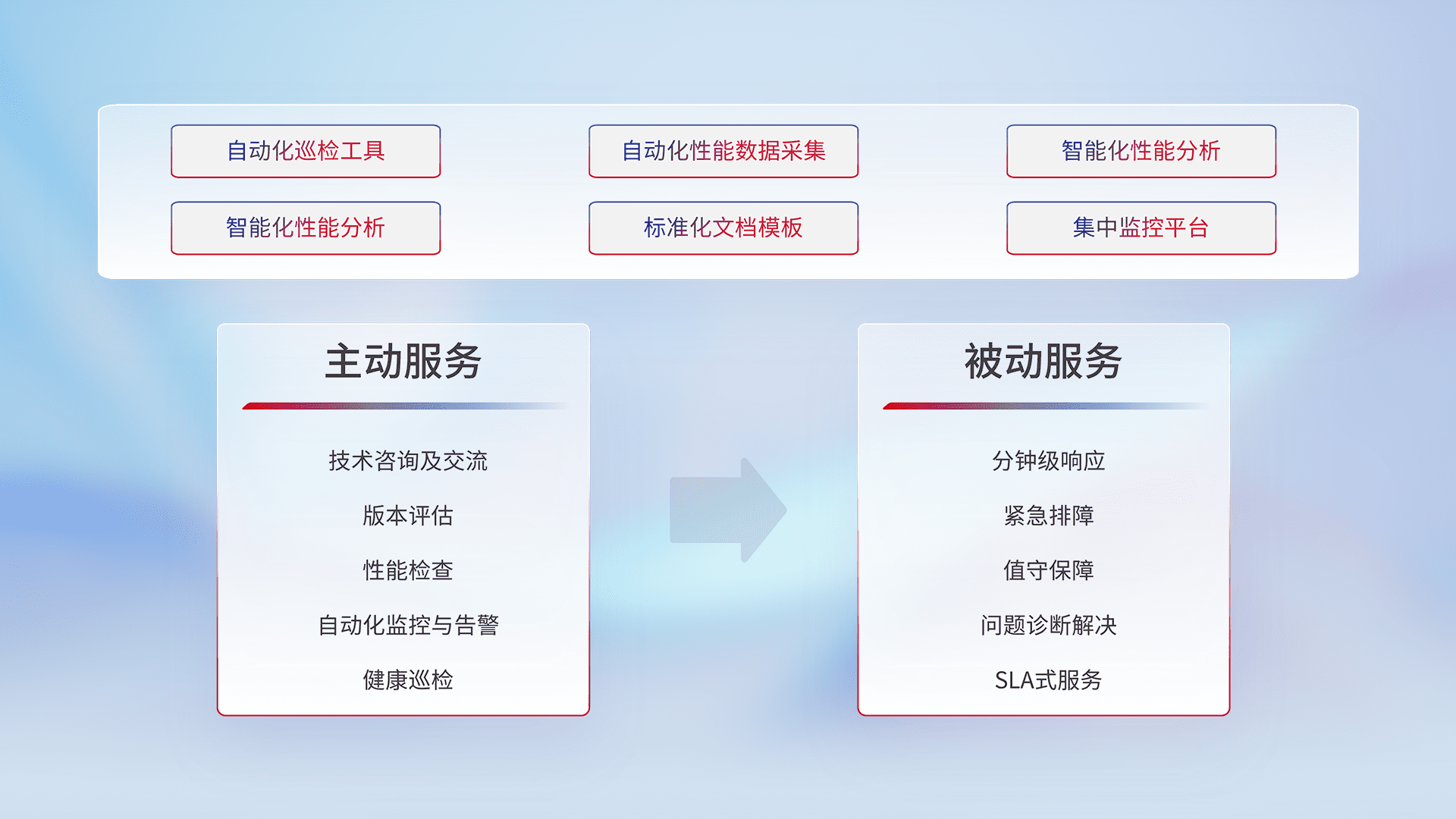 智能化工具和标准化文档,,,保障服务质量,,提供主动服务(包含技术咨询、、版本评估、、性能检查、、、、自动化监控与告警、、、健康巡检)和被动服务包含(分钟级响应、、紧急排障、、值守保障、、、问题诊断解决、、、、SLA服务)。。。。